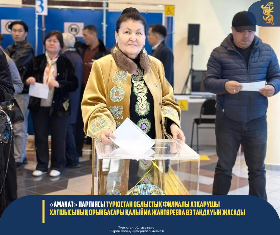 «AMANAT» партиясының Түркістан облыстық филиалының атқарушы хатшысының орынбасары Қалыйма Жантөреева Түркістан қаласындағы Қ.А.Ясауи атындағы ХҚТУ-да орналасқан №133 сайлау учаскесінде өз таңдауын жасады.