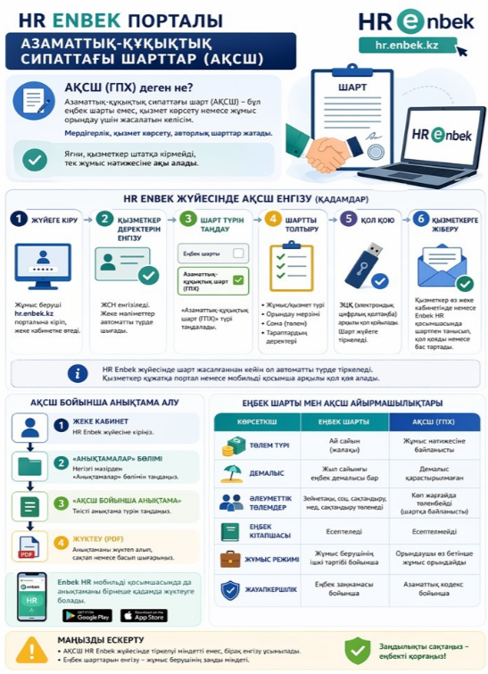Сондай-ақ, еңбек шартында Кодекстің 28-бабында көрсетілген тармақтар болуға тиіс. Өз кезегінде азаматтық-құқықтық сипаттағы шарт (бұдан әрі — МЖӘ) Қазақстан Республикасының Азаматтық кодексімен (бұдан әрі — МЖ) реттеледі. Өтеулі қызмет көрсету шарты азаматтық-құқықтық сипаттағы шартқа (бұдан әрі — МЖӘ) жатады. АК-нің 683-бабының 1-тармағына сәйкес өтеулі қызмет көрсету шарты бойынша Орындаушы Тапсырыс берушінің тапсырмасы бойынша қызмет көрсетуге (белгілі бір іс-әрекеттер жасауға немесе белгілі бір қызметті жүзеге асыруға) міндеттенеді, ал Тапсырыс беруші осы қызметтерге ақы төлеуге міндеттенеді. Сондай-ақ, еңбек қатынастарының субъектілері (тараптары) қызметкер және жұмыс беруші (Кодекстің 19-бабы), ал өз кезегінде өтеулі қызметтер көрсету шартының тараптары Тапсырыс беруші мен орындаушы болып табылатынын ескеру қажет. Еңбек шартынан айырмашылығы, өтеулі қызмет көрсету шартына белгілі бір мамандық, біліктілік немесе лауазым бойынша жұмыс шарттары, жұмыс уақыты мен демалыс уақытының режимі, еңбек жағдайларының сипаттамасы, кепілдіктер мен жеңілдіктер, өтемақы төлеу тәртібі, сақтандыру шарттары кірмейді. Осылайша, егер өтеулі қызмет көрсету шарты Кодекстің 27-бабында көрсетілген талаптардың ешқайсысын қамтымаса, тараптар ҚР Азаматтық кодексіне сәйкес МЖӘ шарты бойынша жұмыс істей алады.