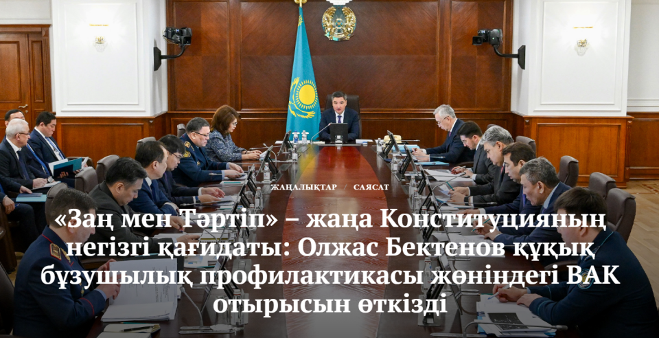 Премьер-министр Олжас Бектенов ҚР Үкіметінің жанындағы құқық бұзушылық профилактикасы жөніндегі ведомствоаралық комиссияның отырысын өткізді. Онда референдумда қабылданған Конституцияның нормаларын сапалы және жедел енгізуді қамтамасыз ету үшін «Заң мен Тәртіп» қағидатын бекіту мәселелері қаралды.