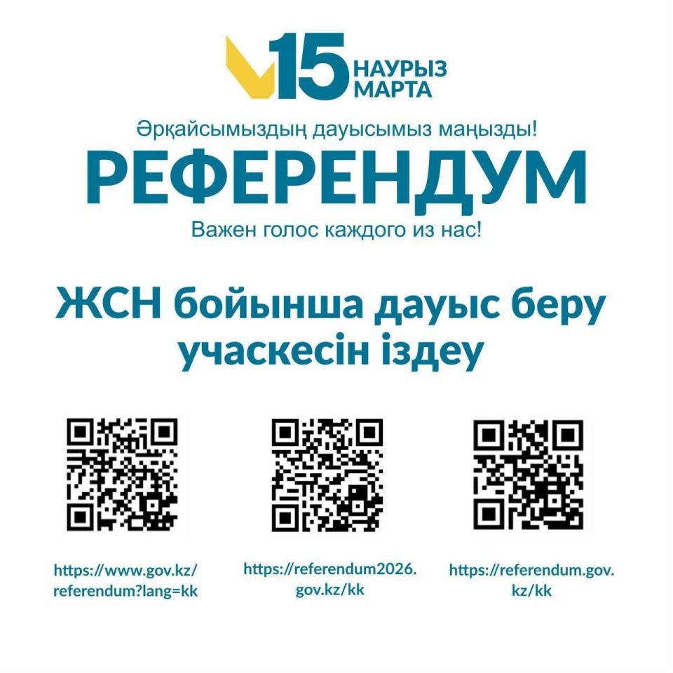 2026 жылғы 15 наурызға тағайындалған республикалық референдумға дайындық аясында азаматтарды ақпараттандыру жұмыстары жүйелі түрде жалғасып жатыр. Бүгінде ел тұрғындарына референдумға қатысу тәртібі, дауыс беру учаскелері және қажетті ақпараттарды алу жолдары туралы кеңінен түсіндіру шаралары жүргізілуде.