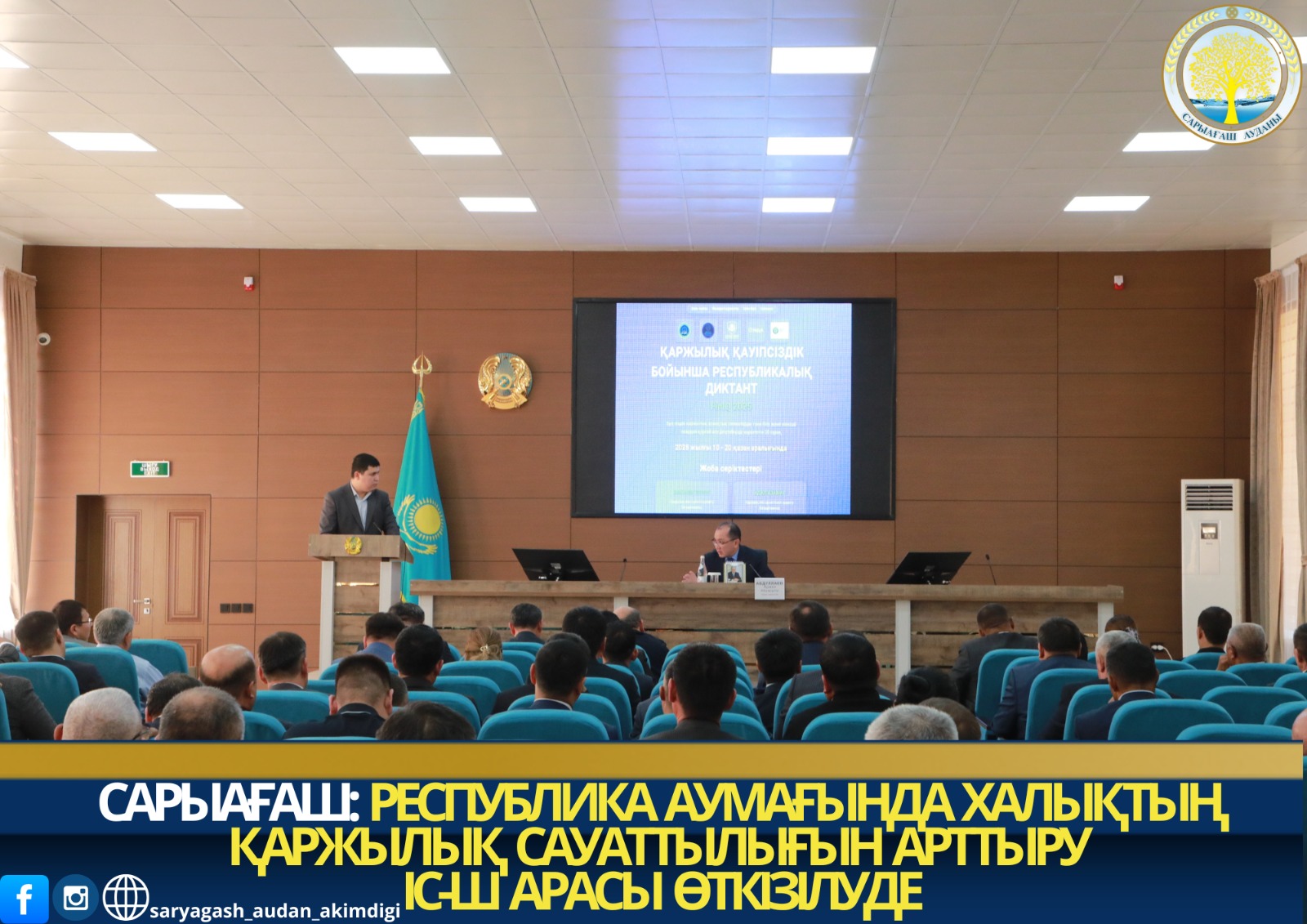Сарыағаш ауданында осы бастаманы кеңінен қолдау мақсатында аудан әкімінің төрағалығымен кеңейтілген семинар өтті. Семинар жұмысына ауданның білім беру ұйымдарының өкілдері, жергілікті атқарушы органдар, құқық қорғау құрылымдары, сондай-ақ республикалық мекемелер мен қоғамдық ұйымдар қатысты. Іс-шара барысында қаржылық сауаттылықтың қоғамдағы рөлі, қаржылық тәуекелдерден қорғану тәсілдері және диктантты тиімді өткізу мәселелері жан-жақты талқыланды.