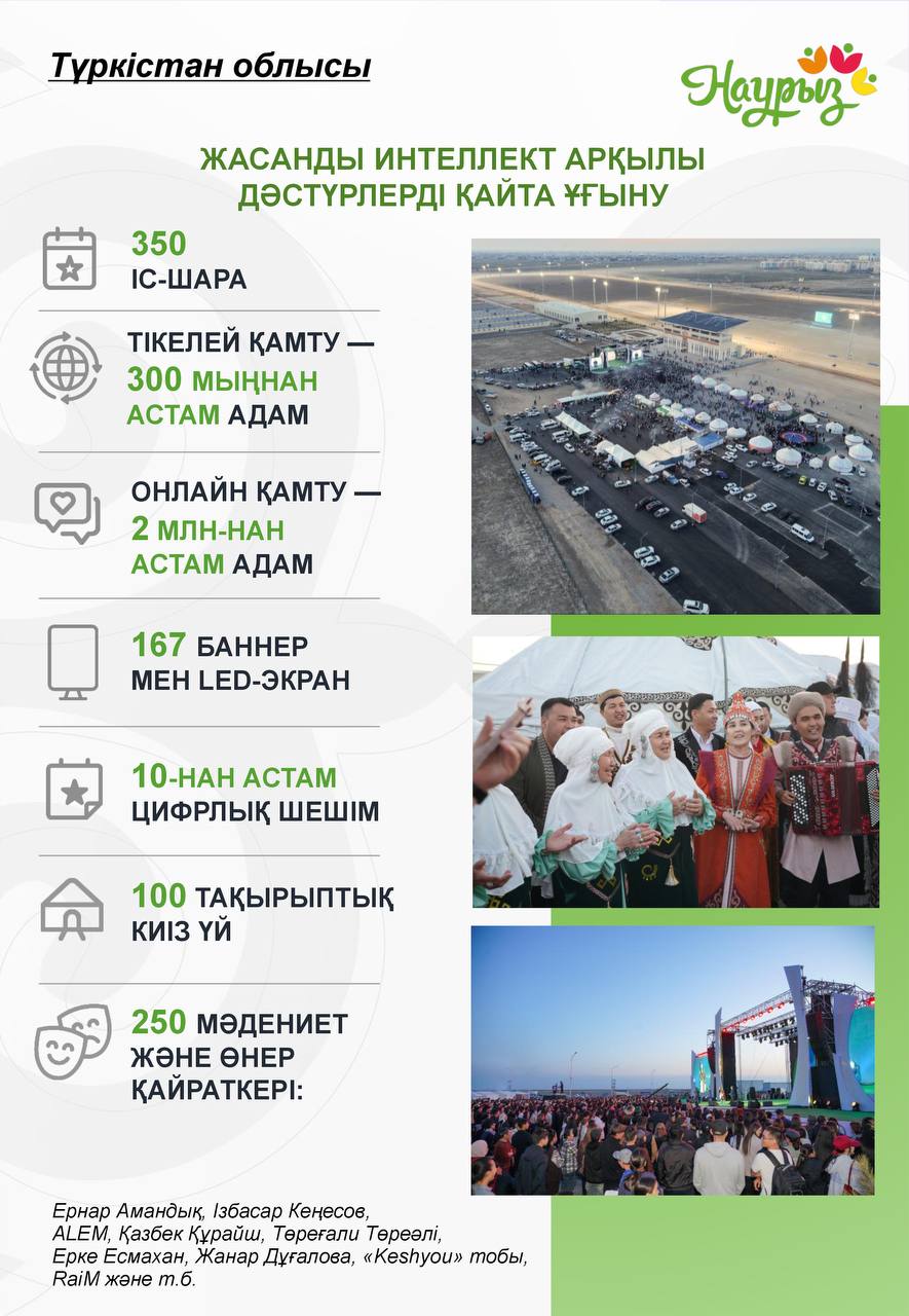 Түркістан облысында биыл Наурыз мейрамы заманауи форматта ұйымдастырылып, ұлттық дәстүрлер мен цифрлық технологиялардың үйлесімі кеңінен көрініс тапты. Өңірде мерекелік бағдарламаларды өткізу барысында жасанды интеллект пен инновациялық IT-шешімдерді қолдануға басымдық берілді.
